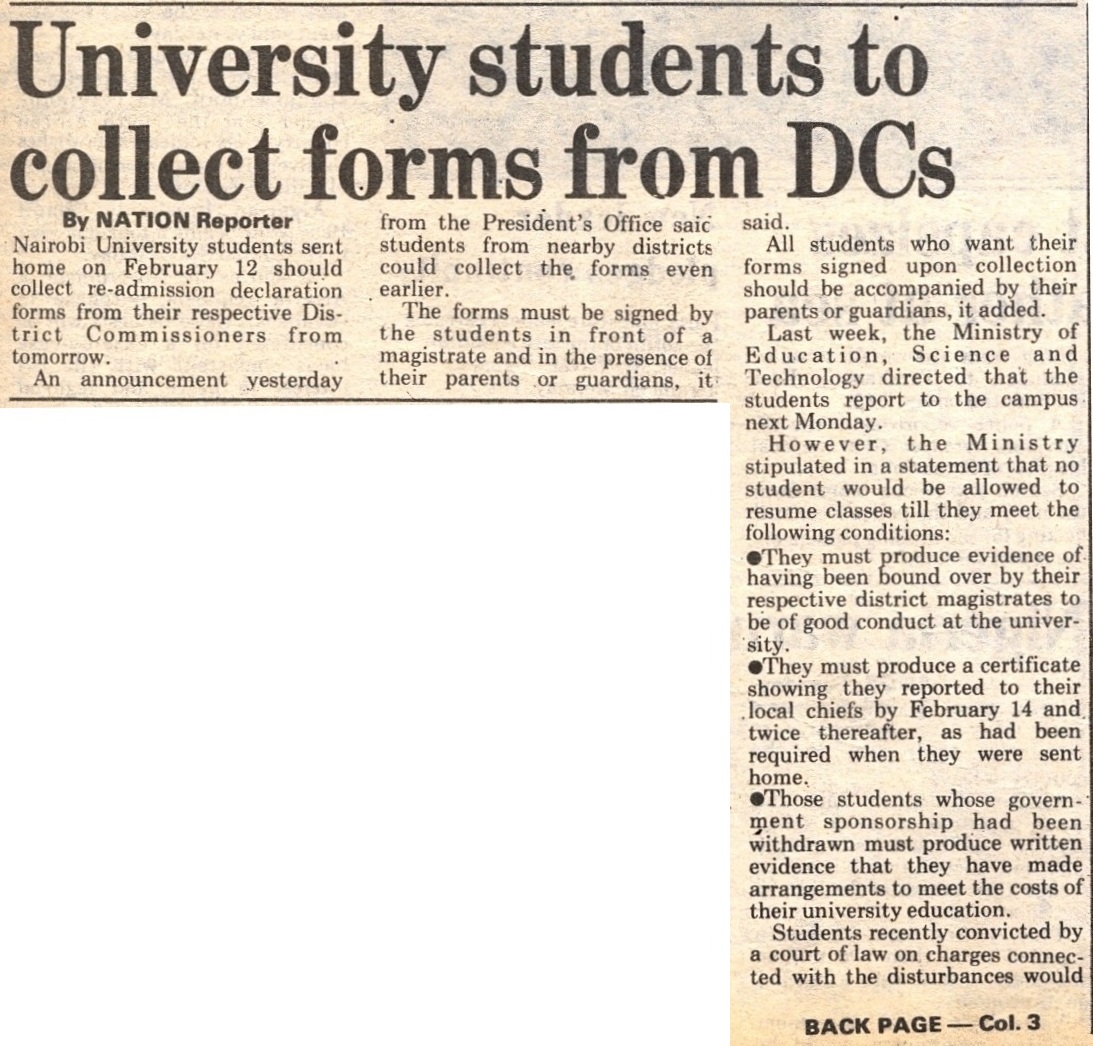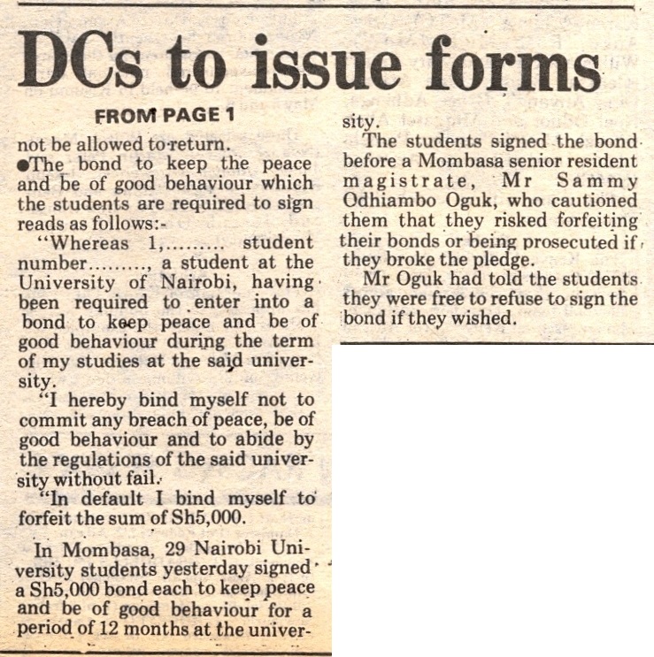 Daily Nation, April 17, 1985 pg 1 & back page.