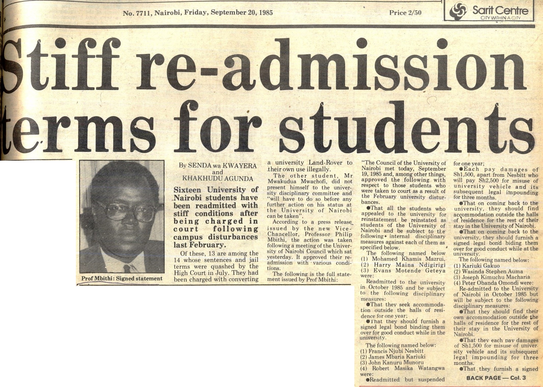 Daily Nation, September 20, 1985 pg 1 & back page.