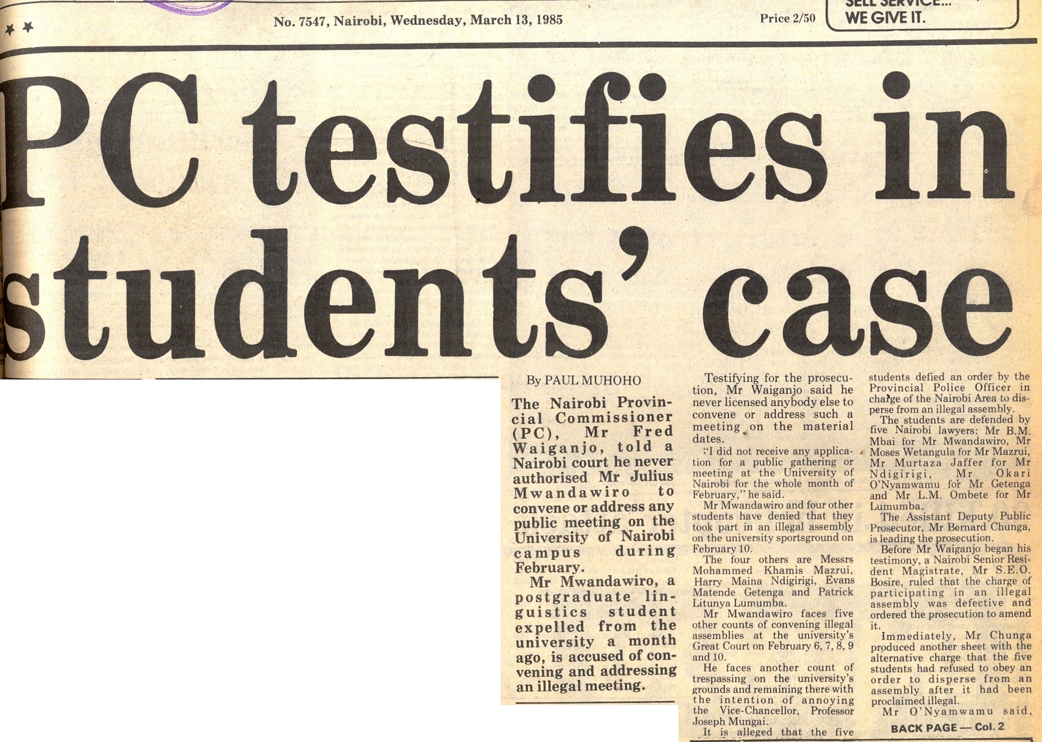 Daily Nation, March 13, 1985 pg 1 & back page.