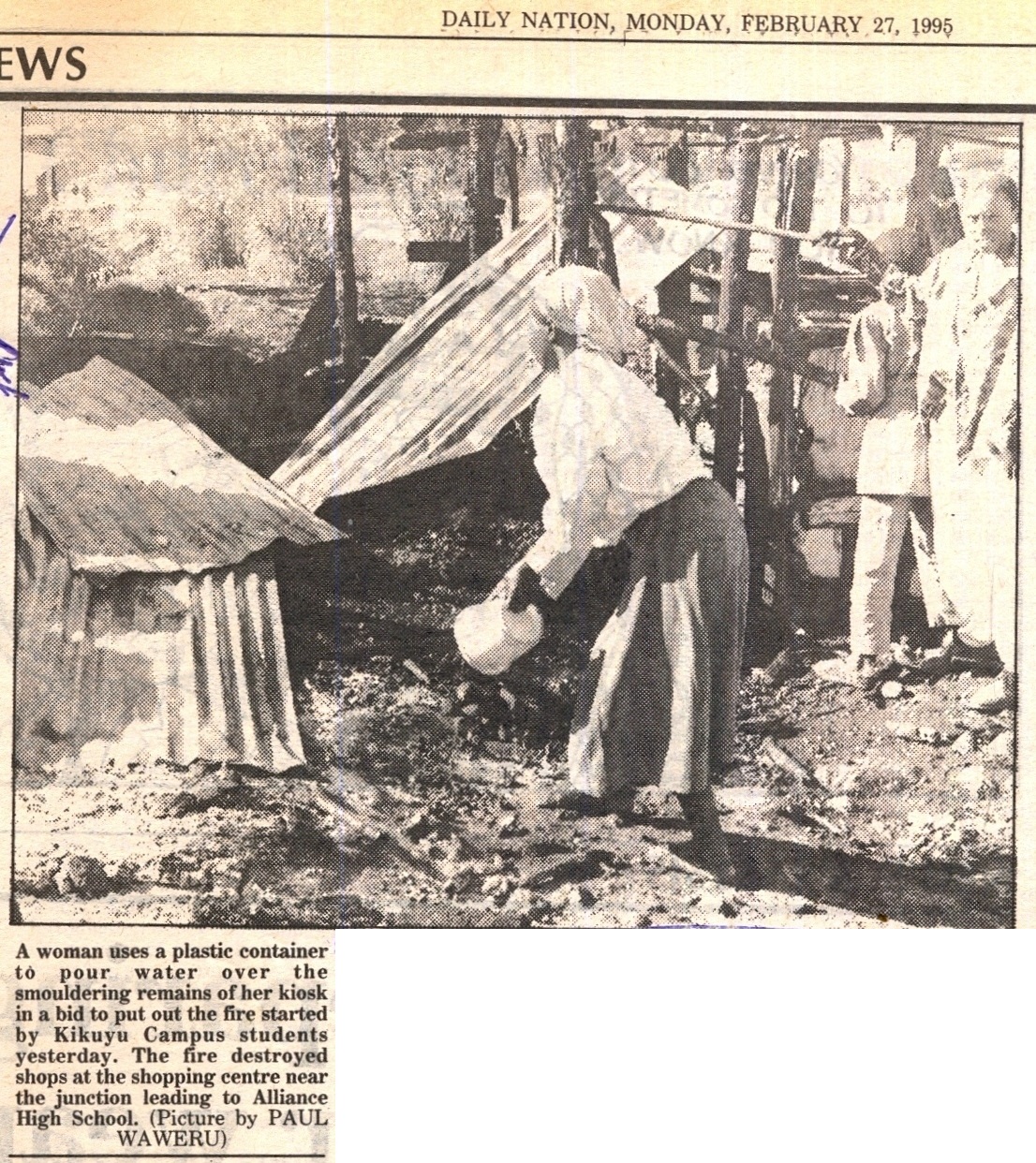 A woman attempts to put out fire started by Kikuyu Campus students-February 27, 1995, pg5.jpg (674.2Kb)