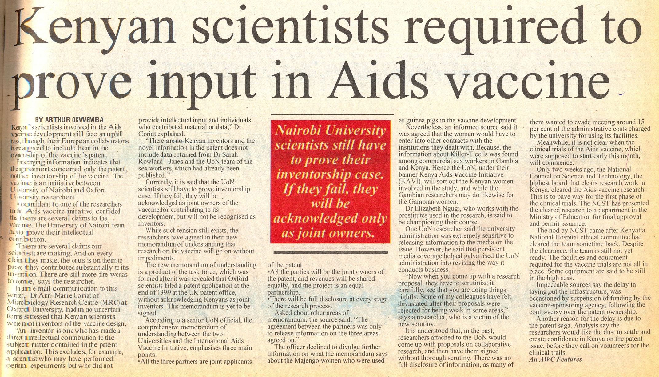Kenyan scientists required to prove input in Aids vaccine-December 14, 2000, page1, Nation Horizon.jpg (2.188Mb)