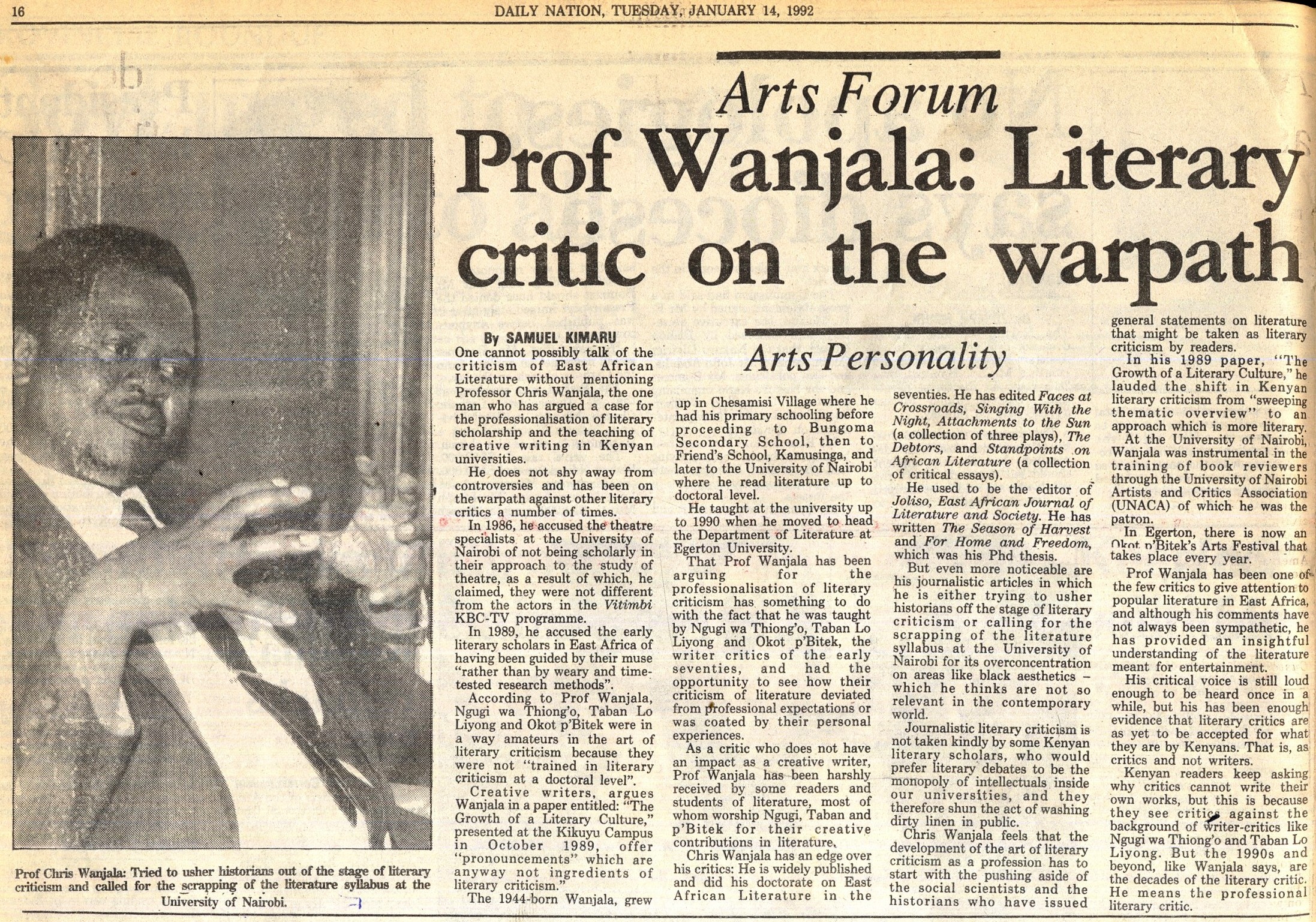 1992-Prof. wanjala; Literary critic on the warpath