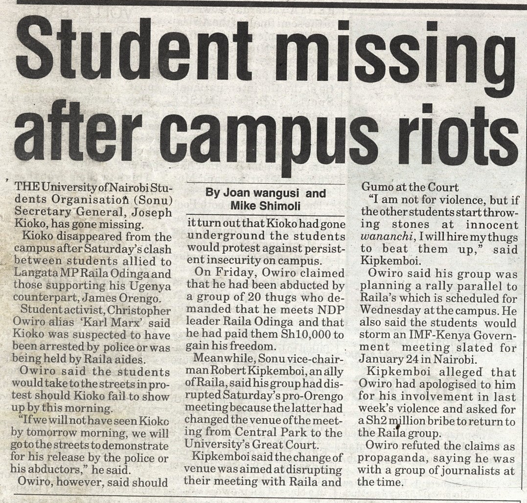 The Standard January 17,2000.Backpage,Student missing after campus riots.